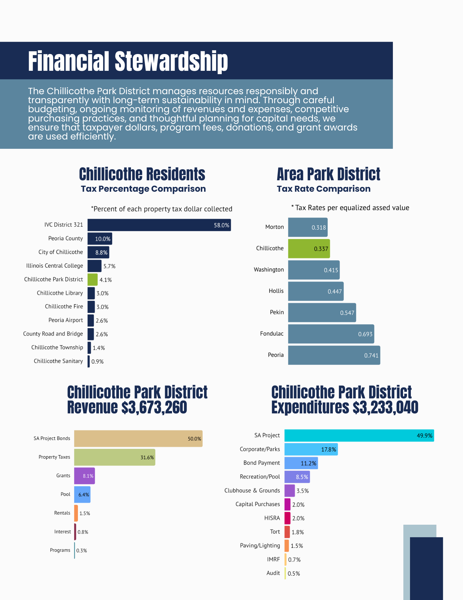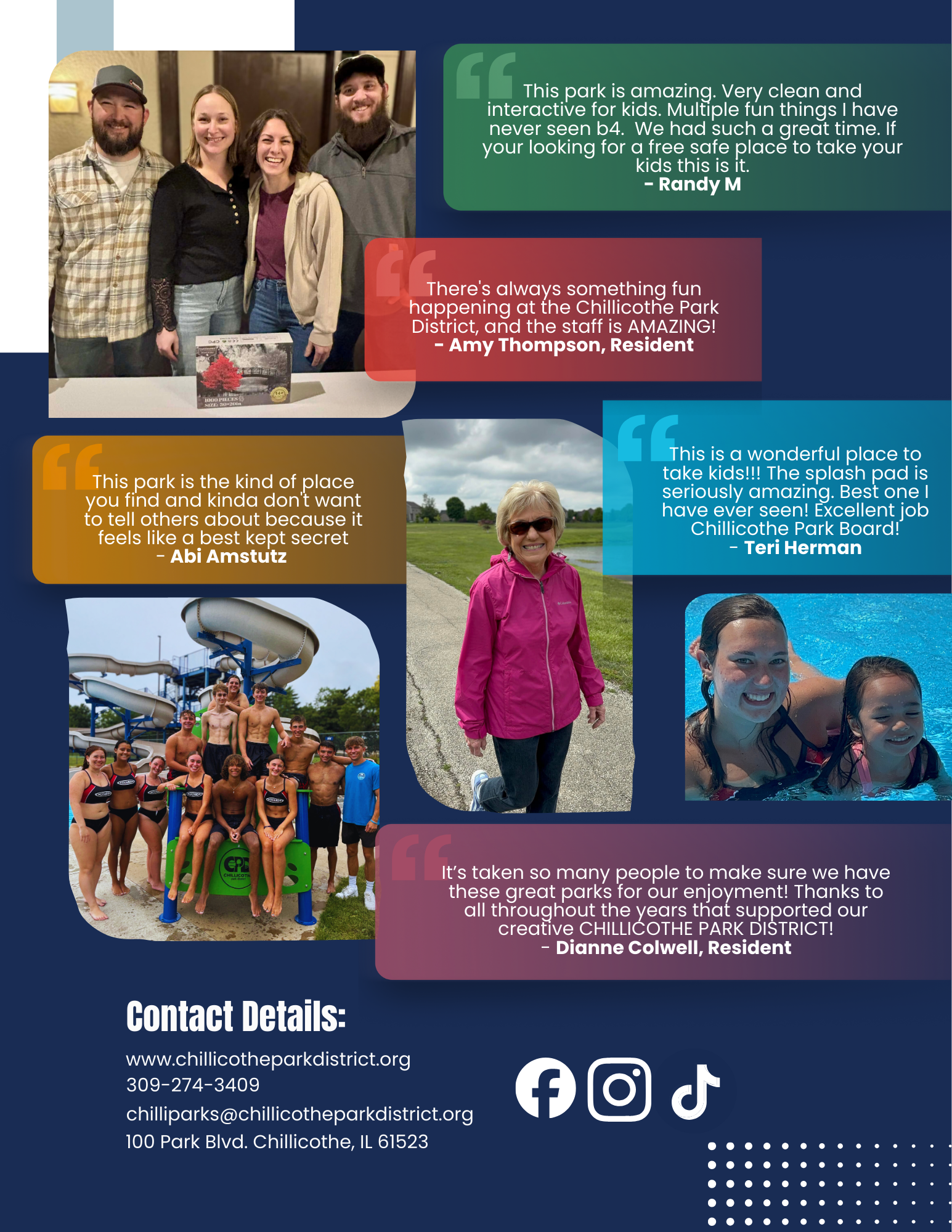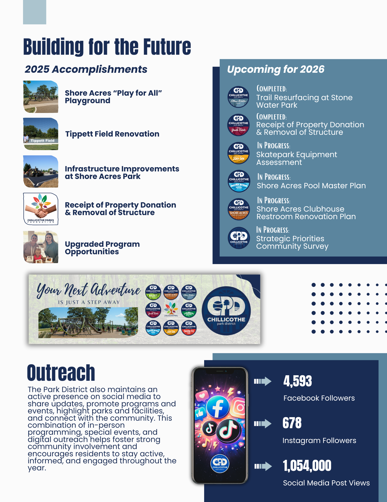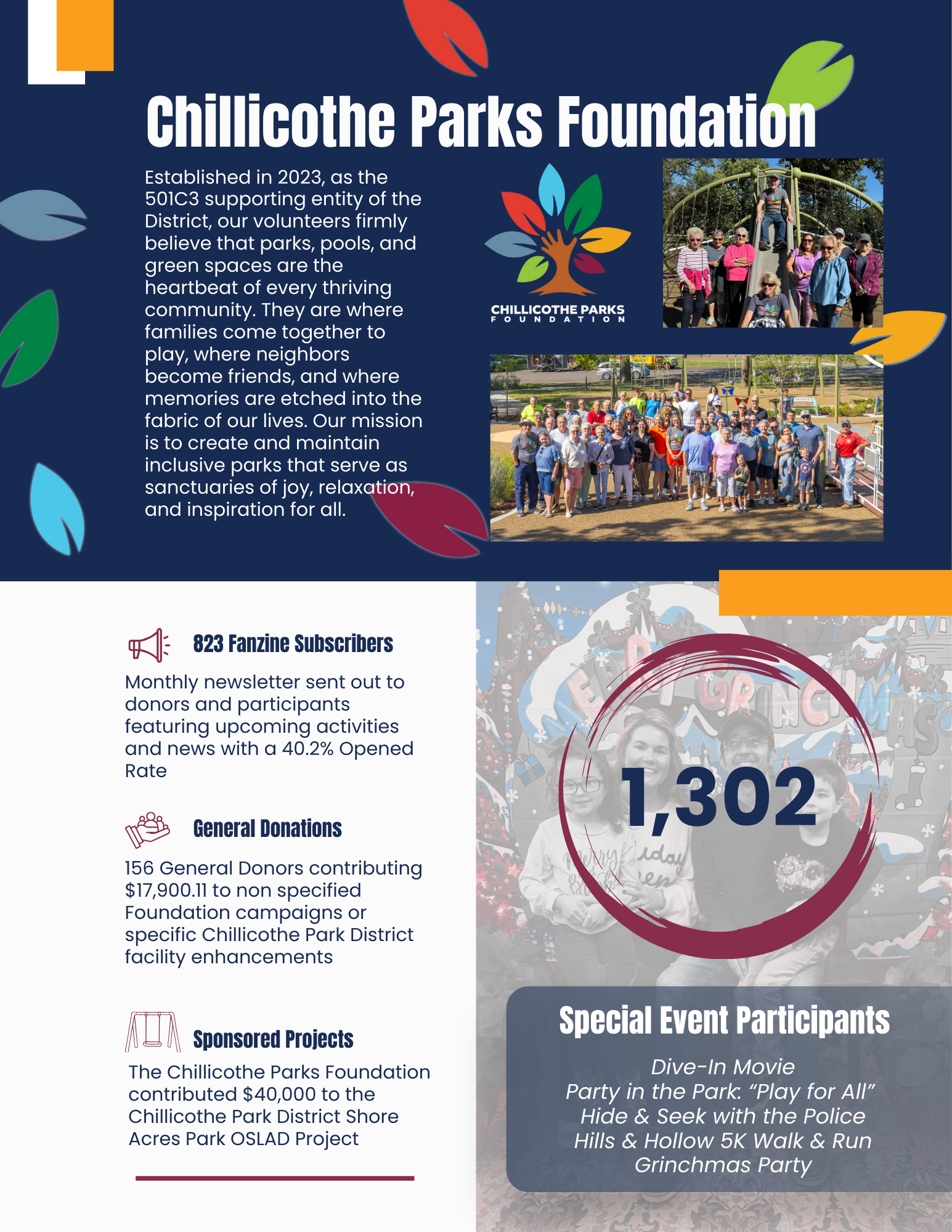 The Chillicothe Park District’s Community Impact Report highlights how our parks, programs, and facilities strengthen quality of life for residents of all ages. It showcases measurable outcomes—such as participation in recreation and wellness programs, improvements to park amenities, and responsible stewardship of public resources. Most importantly, it reflects the Park District’s commitment to building a healthier, more vibrant Chillicothe by creating inclusive spaces and meaningful experiences.
