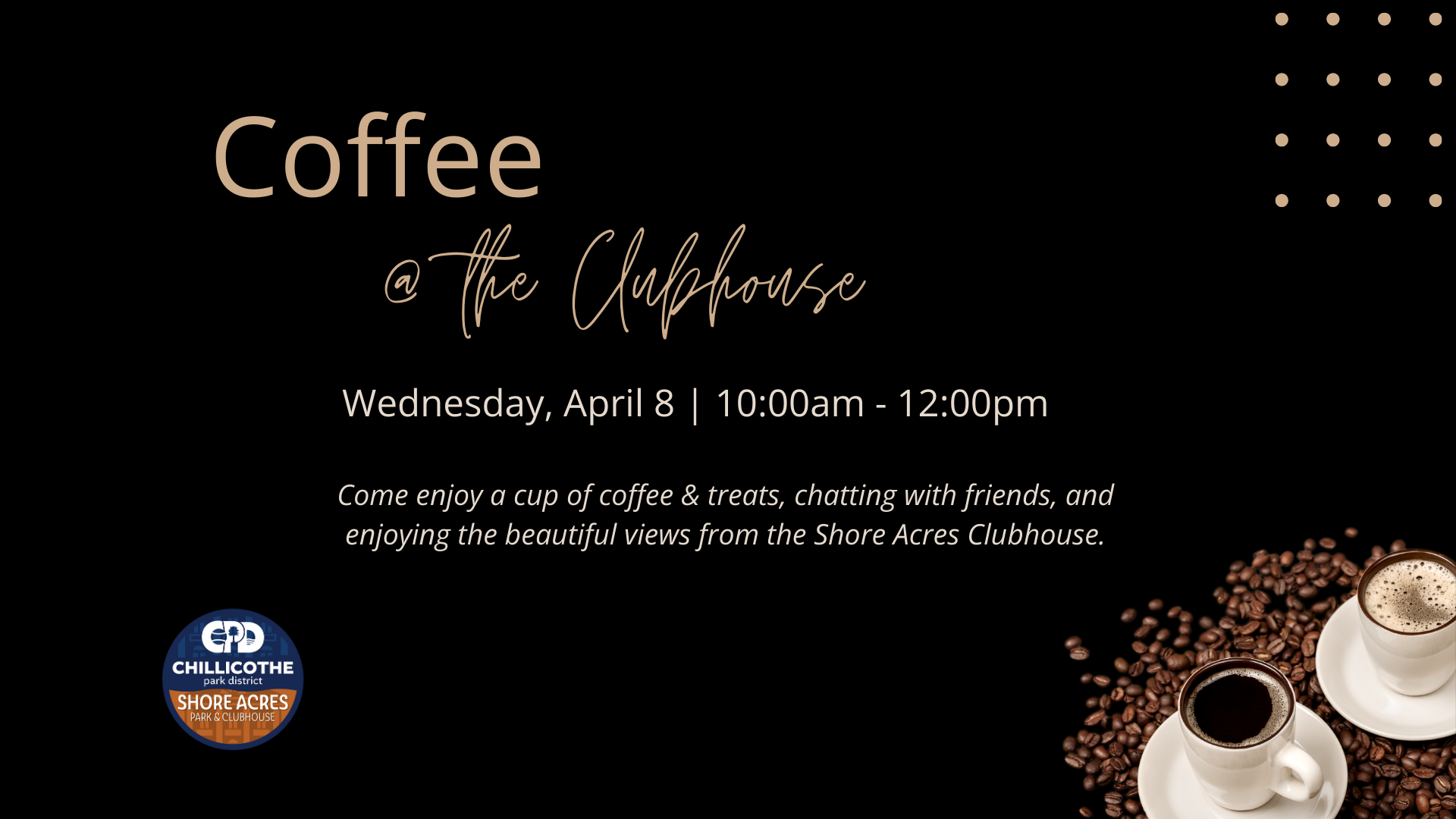 Come enjoy a cup of coffee/tea & treats, chatting with friends, and enjoying the beautiful views from the Shore Acres Clubhouse.